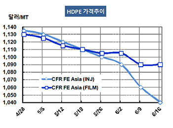 HDPE(High-Density Polyethylene)는 일부 그레이드가 하락했다. HDPE 가격은 6월14일 Injection 그레이드가 CFR FE Asia 톤당 1040달러로 20달러 하락했고 CFR SE Asia도 1060달러로 20달러 떨어졌다. Blow-Molding 그레이드도 FEA가 1060달러, SEA는 1080달러로 20달러 하락했다. 표, 그래프: <HDPE 가격추이> <화학저널 2017/06/19> |