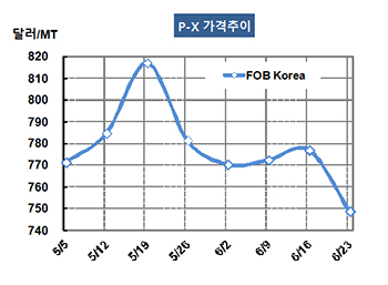 P-X(Para-Xylene)는 750달러까지도 무너졌다. P-X 가격은 6월23일 FOB Korea 톤당 749달러로 28달러 하락했고 CFR SE Asia는 762달러로 28달러 떨어졌다. CFR China 역시 28달러 떨어져 769달러를 형성했다. 표, 그래프: <P-X 가격추이> <화학저널 2017/06/29> |