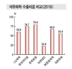 국내 석유화학기업은 수출비중이 2016년 한화토탈 79.3%, 롯데케미칼 74.7%, SK종합화학 67%, LG화학 60%, 대한유화 55% 수준으로 파악되고 있는 가운데 영업이익률은 2016년 대한유화 21.5%, 롯데케미칼 19.2%, 한화토탈 17.9%, 여천NCC 15.0%, SK종합화학 9.8%, LG화학 9.6%를 기록했다.