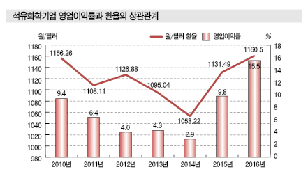 석유화학기업들은 2010-2016년 7년간 환율이 1053.22원으로 가장 낮았던 2014년 영업이익률이 5% 미만에 그쳤으나 2016년에는 대부분 10% 이상으로 급상승한 것으로 파악되고 있다.