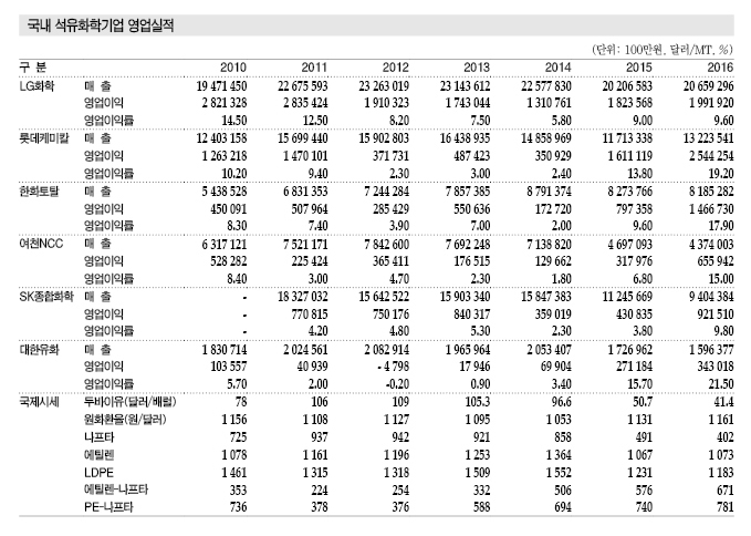 국내 석유화학기업들은 국제유가 하락 뿐만 아니라 에틸렌(Ethylene) 및 PE(Polyethylene) 강세, 원화 약세에 힘입어 2015-2016년 최대 영업실적을 기록했다.