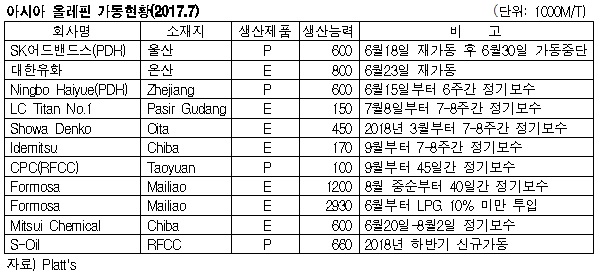 아시아 올레핀(Olefin) 생산설비가 정기보수를 집중하고 있으나 영향이 미미할 것으로 예상되고 있다. 한편, PDH(Propane Dehydrogenation) 플랜트들은 가동중단이 이어지고 있다. 표, 그래프: <아시아 올레핀 가동현황(2017.7)> <화학저널 2017/07/07> |