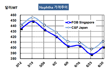 나프타(Naphtha)는 400달러를 회복했다. 나프타 가격은 6월30일 CFR Japan 톤당 412달러로 14달러 상승했고 FOB Singapore도 401달러로 13달러 올랐다. 표, 그래프: <Naphtha 가격추이> <화학저널 2017/07/07> |