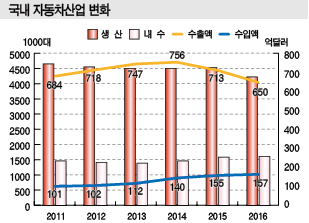 국내 자동차 생산량은 2013년 452만1000대에서 2015년 455만600대로 증가했으며 EV·HEV는 2012년 약 300대에서 2016년 약 6000대로 급증한 것으로 파악된다.