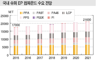 화학경제연구원(대표 박종우)이 2017년 7월 발간한 「슈퍼엔지니어링 플래스틱 시장분석 및 전망(2017)」에 따르면, 국내 슈퍼EP 수요는 컴파운드 기준 2012년 1만5000톤에서 2016년 1만7000톤으로 5년간 2000톤 증가했으며 2020년까지 약 3000톤이 더욱 늘어날 것으로 예상된다.