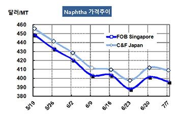나프타(Naphtha)는 국제유가를 타고 다시 하락했다. 나프타 가격은 7월7일 CFR Japan 톤당 409달러로 3달러 하락했고 FOB Singapore은 396달러로 5달러 떨어져 400달러가 무너졌다. 표, 그래프: <Naphtha 가격추이> <화학저널 2017/07/10> |