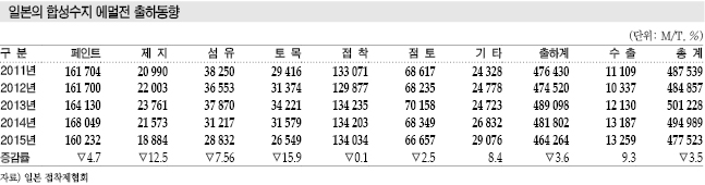 한편, 합성수지 에멀젼은 2015년 내수출하가 46만4264톤으로 전년대비 3.6% 감소해 다소 저조한 것으로 나타났다. 수출이 9.3% 증가했으나 전체 출하량은 47만7523톤으로 3.5% 감소했다.