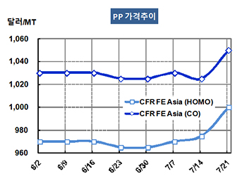 PP 가격은 7월19일 Raffia 및 Injection 그레이드가 CFR FE Asia 톤당 1000달러로 25달러 급등했고 CFR SE Asia도 1065달러로 25달러 올랐다. BOPP는 FEA가 1010달러로 35달러 폭등한 반면, SEA는 1080달러로 25달러 올랐다.