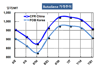 부타디엔(Butadiene)은 일제히 급락세로 전환됐다. 부타디엔 가격은 7월21일 FOB Korea 톤당 910달러로 45달러 급락했고 CFR SE Asia는 910달러로 65달러 폭락했다. CFR China는 960달러로 50달러 떨어졌다. 표, 그래프: <Butadien 가격추이> <화학저널 2017/07/25> |