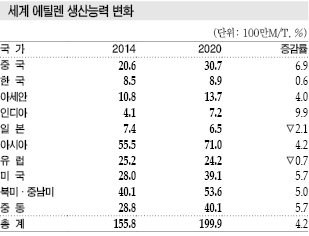 모두 2017년 후반부터 순차적으로 상업생산을 시작하며 2020년까지 에틸렌 생산능력이 1000만톤 이상 확대될 것으로 예상된다.