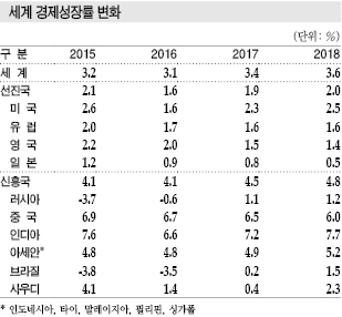 국제통화기금(IMF)에 따르면, 세계 경제는 성장률이 2016년 3.1%에서 2017년 3.4%로 0.3%포인트 상승해 침체에서 벗어날 가능성이 제기되고 있다.
