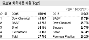 화학제품 매출맥 기준으로 2005년과 2015년을 비교하면 BASF와 Dow Chemical이 1위, 2위를 차지하고 있는 것은 동일하나 2015년에는 Sinopec, Sabic, Formosa Plastics이 3-5위를 차지하는 등 신흥기업이 급부상한 것으로 나타났다.