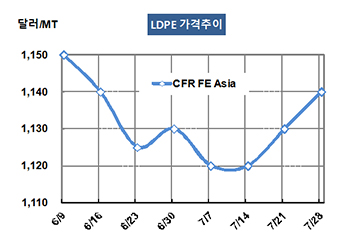 LDPE 가격은 7월26일 CFR FE Asia 톤당 1140달러로 10달러 상승했고 CFR SE Asia도 1170달러로 10달러 올랐다.