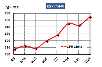 MEG(Monoethylene Glycol)는 800달러대 후반으로 올라섰다. MEG 가격은 7월28일 CFR China 톤당 870달러로 25달러 상승했고 CFR SE Asia도 873달러로 25달러 올랐다. 표, 그래프: <EG 가격추이> <화학저널 2017/07/31> |