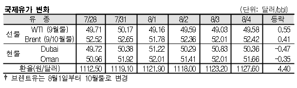 8월4일 국제유가는 미국의 원유 시추리그 수 감소 및 고용지표 개선에 따른 수요 증가 기대, 감산 이행률 제고 기대 등으로 상승했다.