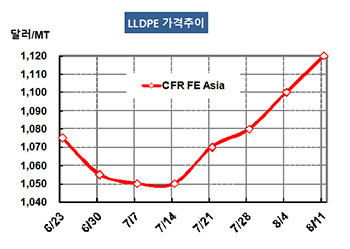 LLDPE 가격은 8월9일 CFR FE Asia 톤당 1120달러로 20달러 상승했을 뿐 CFR SE Asia는 1130달러로 10달러 오르는데 그쳤고 CFR S Asia는 1140달러로 변동이 없었다.