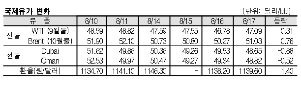 8월17일 국제유가는 미국의 원유 재고 감소 여파 등으로 상승했다. 8월17일 국제유가는 쿠싱지역을 중심으로 미국의 원유 재고가 감소함에 따라 상승했다. 표, 그래프: <국제유가 변화> <화학저널 2017/08/18> |