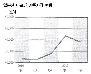 일본산 나프타 기준가격은 2016년 가을부터 상승세를 이어왔으나 2017년 2/4분기 kl당 3만9100엔으로 전년동기대비 2700엔, 6.5% 떨어지며 하락세로 전환됐다.