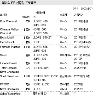 미국에서는 최종결정을 기다리는 일부 프로젝트를 포함해 2022년까지 PE 생산능력을 약 1000만톤 추가해 아시아, 중남미 수출에 주로 투입할 것으로 파악된다.