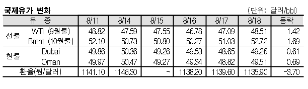 8월18일 국제유가는 미국의 원유 시추리그 수 감소, 나이지리아의 원유 수출 감소 전망, 미국의 정제설비 화재, 미국 달러화 약세 등으로 상승했다. 8월18일 국제유가는 미국의 원유 시추리그 수가 감소한 영향으로 상승했다. 표, 그래프: <국제유가 변화> <화학저널 2017/08/21> |