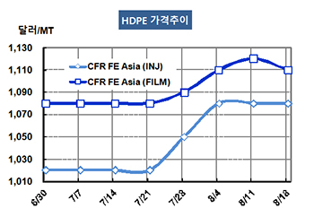 HDPE(High-Density Polyethylene)는 일부 그레이드가 하락했다. HDPE 가격은 8월16일 Injection 그레이드가 CFR FE Asia 톤당 1080달러로 보합세를 형성했고 CFR SE Asia도 1100달러로 변동이 없었다. Blow-Molding은 FEA가 1100달러, SEA는 1120달러로 각각 10달러 상승했다. 반면, Yarn은 FEA가 1140달러, SEA도 1160달러로 각각 10달러 하락했다. 표, 그래프: <HDPE 가격추이> <화학저널 2017/08/21> |