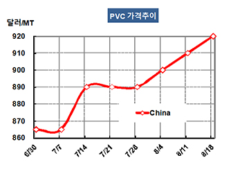 PVC 가격은 8월16일 CFR China 톤당 920달러로 10달러 상승했고 CFR SE Asia는 890달러로 20달러 올랐다. CFR S Asia 역시 980달러로 20달러 상승했다.