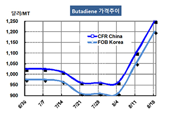 부타디엔(Butadiene)은 또다시 폭등했다. 부타디엔 가격은 8월18일 FOB Korea 톤당 1200달러로 149달러 폭등했고 CFR SE Asia도 1200달러로 150달러 올랐다. CFR China 역시 1250달러로 150달러 폭등했다. 표, 그래프: <Butadiene 가격추이> <화학저널 2017/08/22> |
