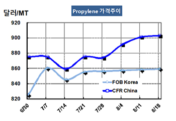 프로필렌 가격은 8월18일 FOB Korea 톤당 859달러로 1달러 상승했고 CFR SE Asia는 770달러를 장기간 유지했다. CFR China는 903달러로 2달러 올랐으나 CFR Taiwan은 900달러로 11달러 하락했다.