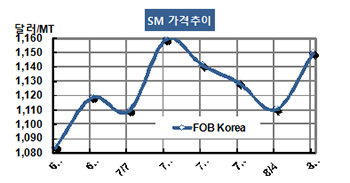 SM(Styrene Monomer)은 다시 강세로 돌아섰다. SM 가격은 8월18일 FOB Korea 톤당 1171달러로 22달러 상승했고 CFR SE Asia는 1228달러로 22달러 올랐다. CFR India 역시 22달러 상승해 1223달러를 형성했다. 표, 그래프: <SM 가격추이> <화학저널 2017/08/23> |