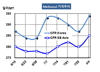 메탄올(Methanol)은 오랜만에 300달러를 돌파했다. 메탄올 가격은 8월18일 CFR Korea 톤당 302달러로 10달러 상승했고 CFR SE Asia도 292달러로 8달러 올랐다. CFR China 역시 10달러 상승해 293달러를 형성했다. 표, 그래프: <Methanol 가격추이> <화학저널 2017/08/25> |