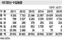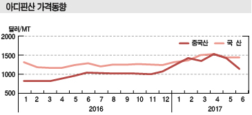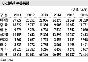 표, 그래프: <아디핀산 수입동향, 아디핀산 가격동향, 아디핀산 수출동향> <화학저널 2017년 8월 28일> |