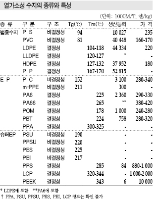 열가소성 수지는 PE(Polyethylene) 등 대량 생산되는 저가의 범용수지, 내열성과 기계적 특성이 우수한 PC(Polycarbonate) 등 EP(Engineering Plastic)가 대표적이다.