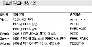 PEEK 생산 1위인 영국 Victrex를 비롯해 후발기업인 독일 Evonik, 벨기에 Solvay, 프랑스 Arkema 등은 시장이 성장할 것으로 판단하고 성능이 우수한 PAEK를 중심으로 생산능력을 확대하고 있다.