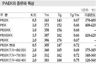 PEEK(Polyether Ether Ketone)로 대표되는 방향족 PAEK(Polyaryl Ether Ketone)계는 연속 사용온도가 섭씨 260도로 내열성, 내약품성, 내열수성, 난연성, 역학특성, 전기특성이 뛰어나 열가소성 수지 가운데 가장 우수한 성능을 보유하고 있다.