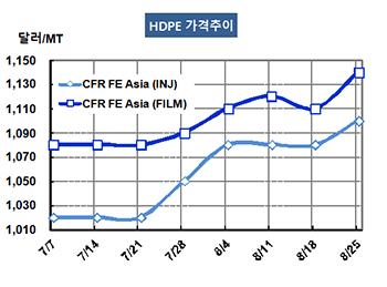 HDPE(High-Density Polyethylene)는 1100달러에 도달했다. HDPE 가격은 8월23일 Injection 그레이드가 CFR FE Asia 톤당 1100달러로 20달러 상승했고 CFR SE Asia도 1120달러로 20달러 올랐다. Film은 FEA가 1140달러로 30달러, SEA는 1160달러로 20달러 상승했다. 표, 그래프: <HDPE 가격추이> <화학저널 2017/08/28> |