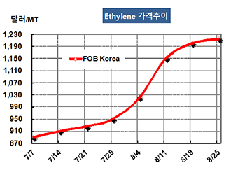 에틸렌(Ethylene)은 1200달러를 넘어서도 오름세를 계속했다. 에틸렌 가격은 8월25일 FOB Korea 톤당 1215달러로 15달러 상승했고 CFR SE Asia도 1125달러로 15달러 올랐다. 표, 그래프: <Ethylene 가격추이> <화학저널 2017/08/28> |