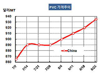 PVC(Polyvinyl Chloride)는 900달러대 중반을 향해 발걸음을 옮기고 있다. PVC 가격은 8월23일 CFR China 톤당 935달러로 15달러 상승했고 CFR SE Asia는 920달러로 30달러 급등했다. 반면, CFR India는 980달러로 변동이 없었다. 표, 그래프: <PVC 가격추이> <화학저널 2017/08/29> |