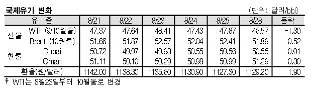 8월28일 국제유가는 미국의 원유 재고 증가 전망 등으로 하락했다. 8월28일 국제유가는 미국의 원유 재고가 증가할 것이라는 전망이 제기된 영향으로 하락했다. 표, 그래프: <국제유가 변화> <화학저널 2017/08/29> |