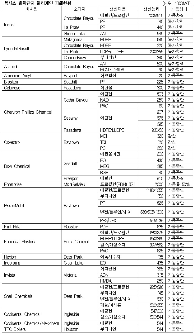 미국 텍사스 화학단지는 초대형 허리케인이 북상해 가동중단이 이어지고 있다. Ineos, LyondellBasell, Ascend 등 화학기업들은 허리케인이 북상한 8월25-27일 에틸렌(Ethylene), 프로필렌(Propylene), PE(Polyethylene), PP(Polypropylene) 등 플랜트를 가동을 중단하는데 그쳤으나 피해규모가 확산돼 28일 불가항력을 선언했다. <화학저널 2017/08/29> |