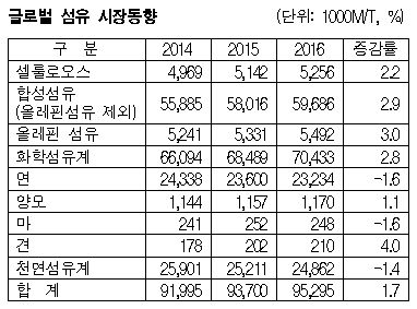 일본 화학섬유협회에 따르면, 글로벌 섬유 수요는 2016년 9530만톤으로 전년대비 1.7% 늘어나며 8년 연속 증가세를 기록했다.,