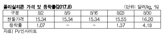표, 그래프: <폴리실리콘 가격 및 등락률(2017.8) > <화학저널 2017/08/31> |