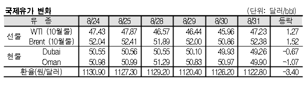8월31일 국제유가는 저가 매수세 유입, OPEC(석유수출국기구)의 원유 생산 감소, 미국의 원유 및 석유제품 수요 증가 전망, 미국 달러화 약세 등으로 상승했다. 8월31일 국제유가는 저가 매수세가 유입된 영향으로 상승했다. 표, 그래프: <국제유가 변화> <화학저널 2017/09/01> |