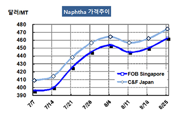 나프타(Naphtha)는 500달러를 향해 진군하고 있다. 나프타 가격은 8월25일 CFR Japan 톤당 474달러로 12달러 상승했고 FOB Singapore 역시 462달러로 12달러 올랐다. 표, 그래프: <Naphtha 가격추이> <화학저널 2017/09/01> |