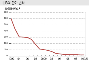 LiB는 생산능력 확대 및 생산기술·수율 향상에 따라 제조코스트가 와트당 약 200원으로 LiB 양산을 시작한 1994년경에 비해 15분의 1 수준으로 떨어지고 기술 혁신으로 에너지밀도가 약 3배 향상됨에 따라 최근 가격이 출시 당시에 비해 3분의 1 수준으로 급락했다.