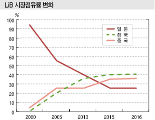 그러나 휴대폰 보급과 함께 2000년 이후 삼성SDI, LG화학, 중국 BYD 등이 부상함에 따라 일본기업들은 2010년 들어 국내기업에게 시장점유율을 추월당했고 현재 휴대폰, 노트북 등 민간용 LiB 생산비중은 국내기업이 40% 이상이며 중국기업이 30% 이상, 일본기업은 30% 미만으로 나타나고 있다.