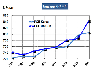 벤젠(Benzene)은 800달러대를 크게 넘어설 것으로 예상된다. 벤젠 가격은 9월1일 FOB Korea 톤당 805달러로 10달러 상승했고 FOB SE Asia 역시 802달러를 형성했다. CFR China도 818달러로 올라섰다. 표, 그래프: <Benzene 가격추이> <화학저널 2017/09/06> |