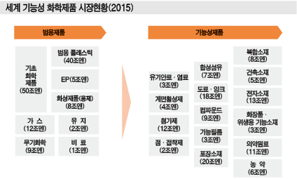 표, 그래프: <세계 기능성 화학제품 시장현황(2015)> <화학저널 2017년 9월 11일> |