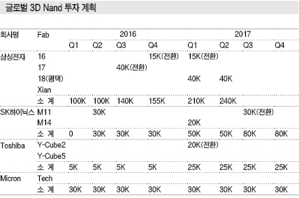 삼성전자는 2017년 평택에 대규모 3D Nand 생산라인을 신규가동했고 Toshiba·Sandisk, Intel·Micron 역시 생산기술 격차를 줄이며 대규모 증설 투자에 돌입할 방침이다.