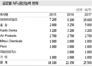 NF3 생산능력은 2016년 8200톤에서 2017년 말 1만600톤으로 확대하며, 효성은 3250톤에서 5000톤으로 확대할 예정이다.