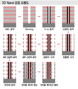 반도체 생산기업들은 2D Nand가 더이상 미세공정화를 추진하기 어려워 3D Nand 양산기술 투자에 적극적으로 나서고 있다.